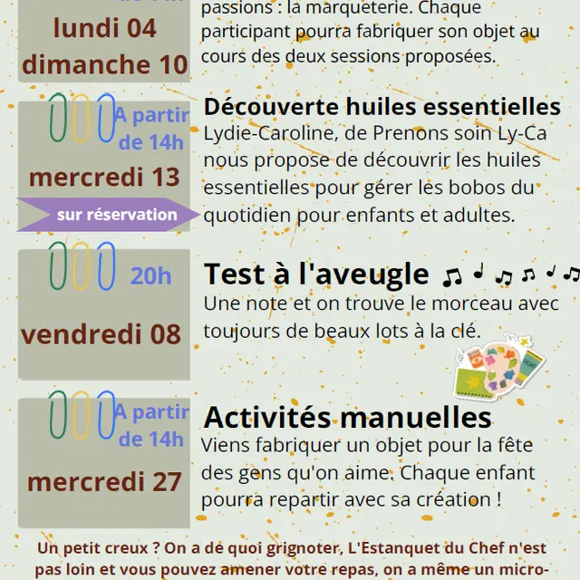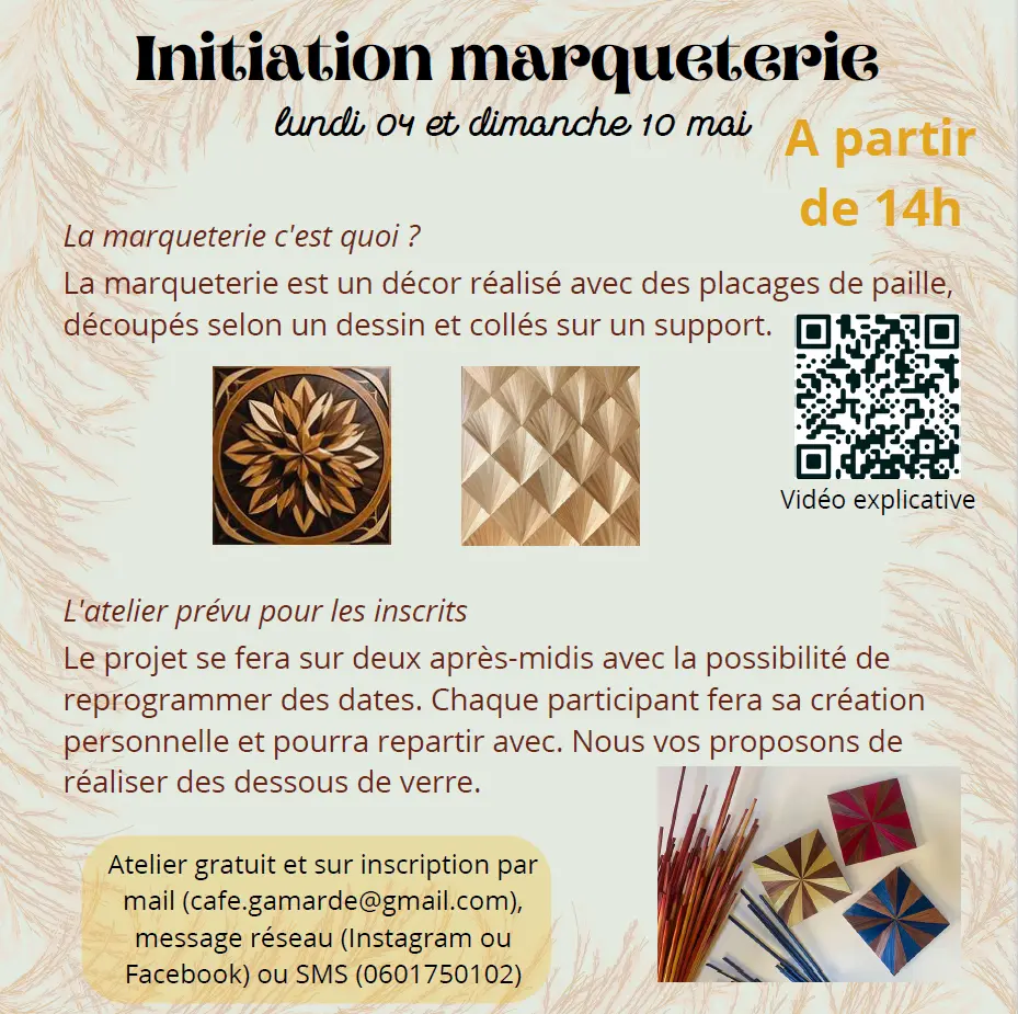 Sylvie vous fera découvrir l'une de ses passions : la marqueterie. Chaque participant pourra fabriquer son objet au cours des deux sessions proposées. Les 04 et 10 mai, sur inscription.